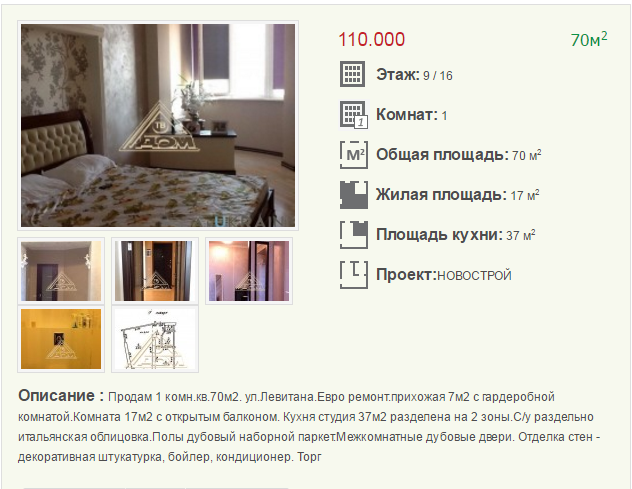 Самая дорогая 1-к квартира продается за 110 000 $, улица Левитана.