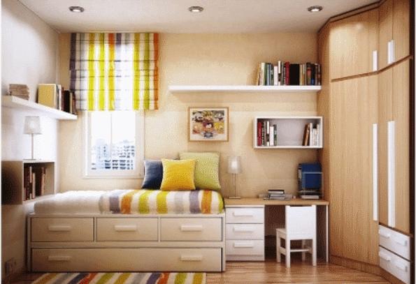 • Играет роль грамотность распределения мебели. Учитывая ограниченность размеров комнаты, нужно использовать все возможности. Скажем, кровать можно разместить в углу, а не возле стены.